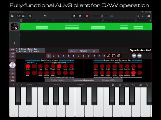 Synclavier Go! Présente le clavier avec le panneau de boutons original Velocity-Pressure Keyboard (VPK). Il est adapté au système de reconnaissance gestuelle très sensible de l'iPad. Sous le capot se trouve le puissant moteur DSP CSynclavier, complet avec Timbre Partiel, Timbre Frame, FM-Synthesis et Additive-Synthesis.
