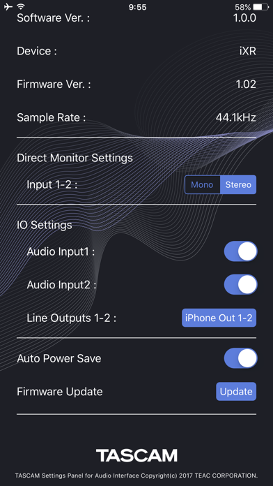 This app enables you to setup and update the TASCAM iXR Audio/MIDI Interface's firmware directly and without a PC.