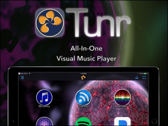 Developed by SoundSpectrum Inc., the makers of the 'classic' iTunes visualizer and screensaver. Tunr is an ad-free, all-in-one visual music player that connects you to top music services and streaming providers, including: Spotify, Pandora, iHeartRadio, SoundCloud, your iTunes music library, Sound Spaces ambient audio library, and an ever-expanding universe of podcasts and internet radio stations!