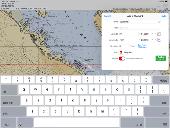 Mark waypoints precisely using charts or satellite maps, place names or addresses, geotagged photos, or by projecting from a known point.