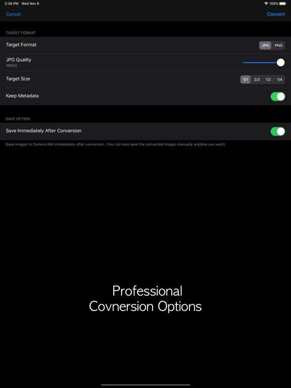 • Save converted JPG and PNG files to Camera Roll.