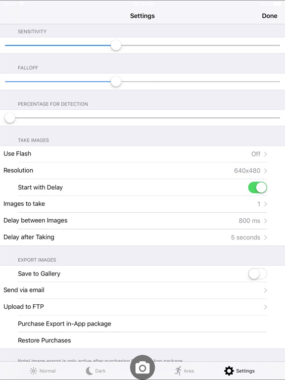 - image taking settings, delay between images and detections