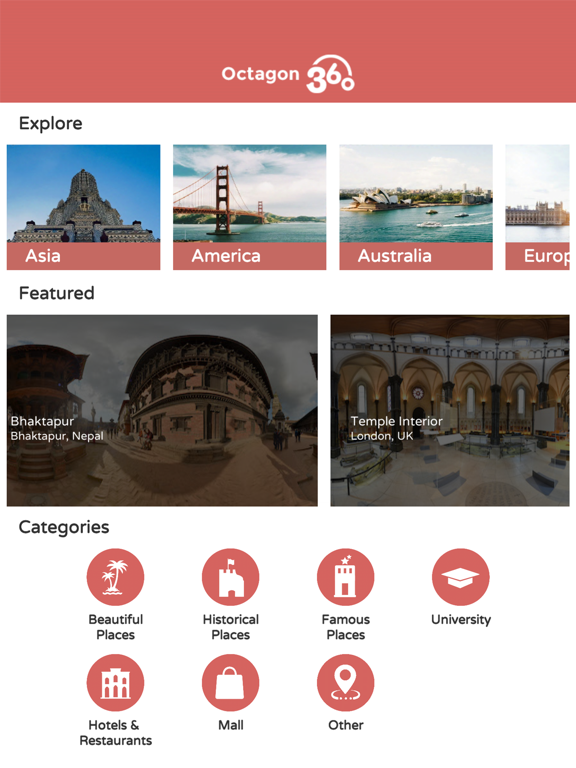 The Octagon 360 is a mobile application designed to serve as a platform of discovery and sharing for enthusiasts of 360 panoramic images and videos from around the world. With the aid of a VR headset, the Octagon 360 enables anyone to access our extensive collection of virtual tours and 360 videos spanning the four corners of the globe and view them in VR mode.