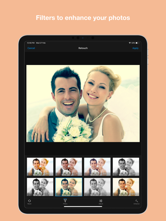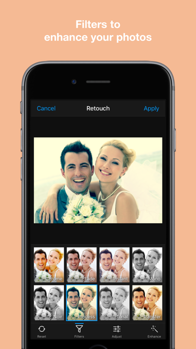 - Photo filters and crop to get that perfect look. Custom slider controls for Pro users to retouch photos.