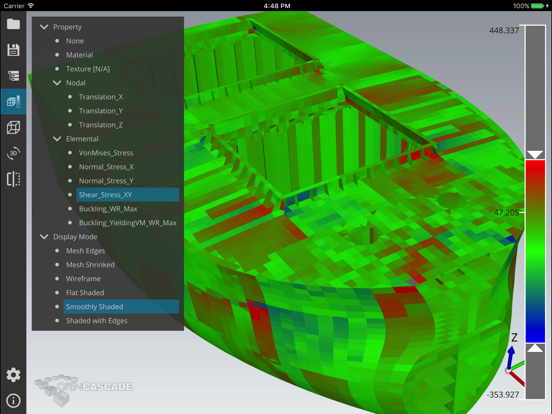 CAD Assistant allows you to view the mesh in wireframe, shaded, and shrink view. If mesh contains associated textures, colors, or scalar data, it can be viewed with elements colored according to the selected property. For scalar quantities interactive color scale is shown, providing controls to manipulate the range of displayed quantities.