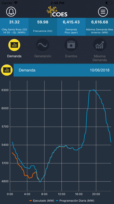 Aplicativo móvil que permite visualizar consultas de los principales datos de la Operación del Sistema Eléctrico Interconectado Nacional (SEIN), tales como: Demanda programada y ejecutada, Generación, Eventos relevantes, Mantenimiento programado de unidades, Máxima demanda y Frecuencia del SEIN y Costos marginales en tiempo real.