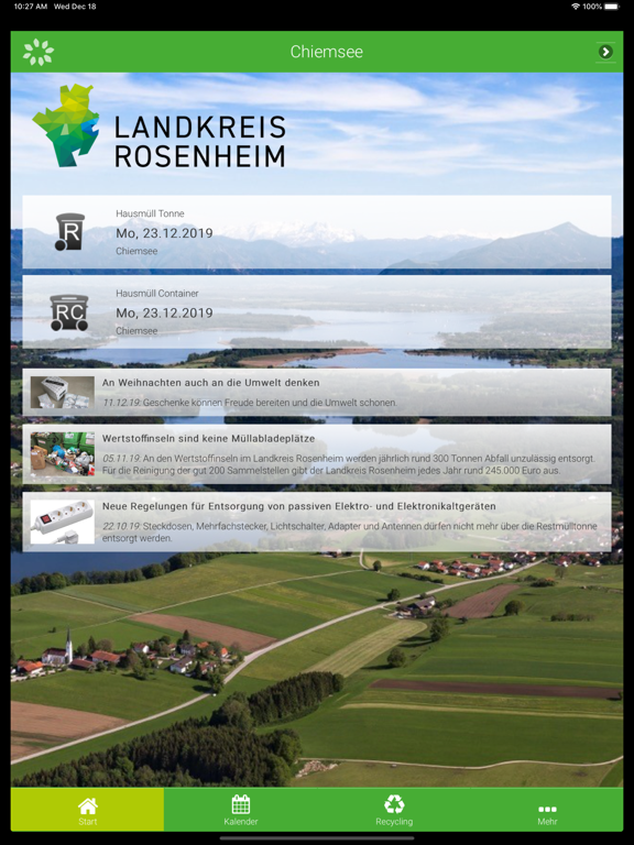 Die neue Abfall-App des Landkreises Rosenheim. Bleiben Sie immer informiert - über Abfuhrtermine, Annahmestellen, Problemmüll und vieles mehr.