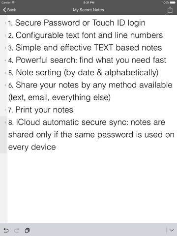 "My Secret Notes" vous permet de garder toutes vos notes, des projets, des pages de journal et des idées en toute sécurité, les protéger avec un mot de passe (et si vous voulez vous pouvez utiliser Touch ID / Face ID).