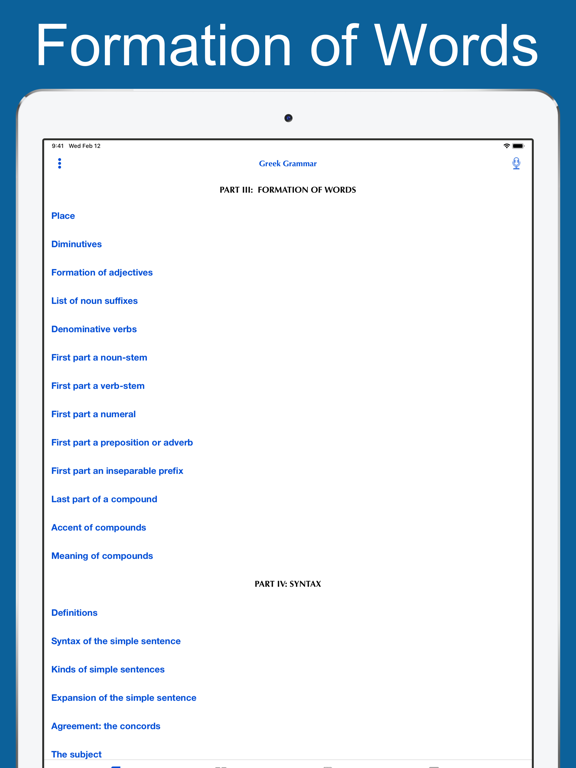 This app provides an offline version of 'A Greek Grammar for Colleges'. This app will answer all of your questions in detail, and give you such a sweeping overview of Greek grammar.