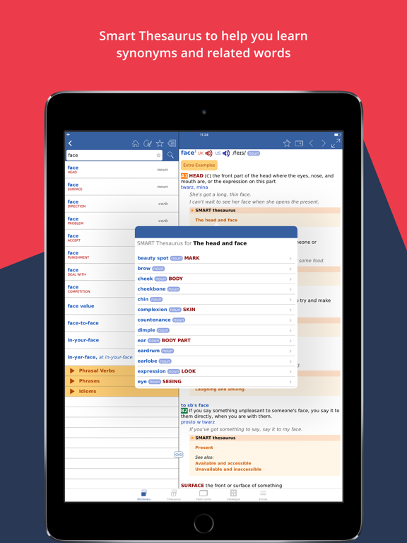 • Thesaurus feature helps you to learn different words with the same meaning.