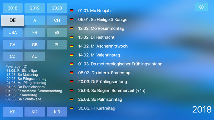 Holidays from 10 countries: Germany, Switzerland, Austria, USA, France, Spain, Canada, Great Britain, Poland, Czech Republic.