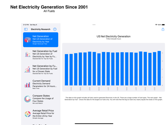 This app provides graphical views of US electricity generation in a variety of formats, including total United States generation over time, generation by source, generation by source by state, current generation demand and more.