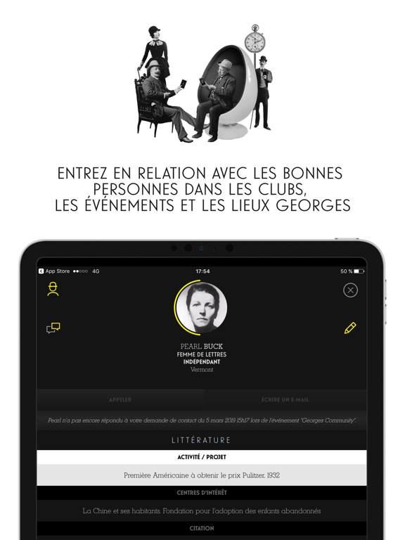 Who is Georges? est la première solution de géolocalisation indoor de proximité, elle est la seule solution qui permet de connaître l’identité et le profil des personnes autour de soi, de découvrir les intérêts communs et d'identifier les personnes à rencontrer pour enrichir son réseau de contacts qualifiés lors d’événements professionnels.