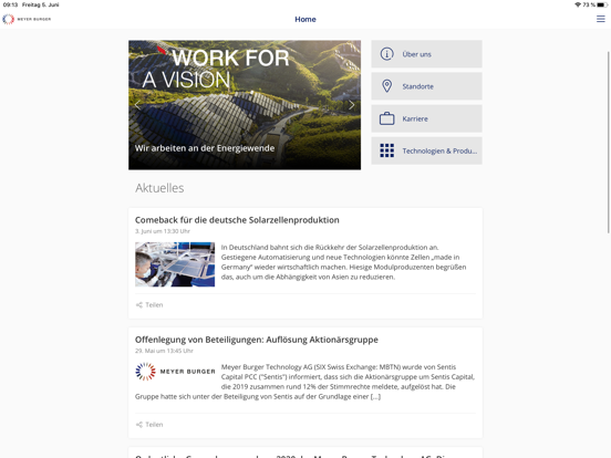 • News: bleiben Sie auf dem neuesten Stand mit den aktuellsten Neuigkeiten. Durch Push Notifications sehen Sie sofort, was es spannendes Neues aus der Welt der Meyer Burger Technology gibt.