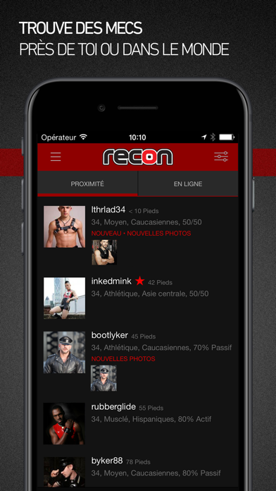 Recon est la plus grande application, plateforme et communauté en ligne au monde dédiée aux rencontres entre adeptes du kink et du fétichisme, exclusivement réservée aux hommes gays, bisexuels, queer, transgenres et curieux aimant tout ce qui est en lien avec le fétichisme.