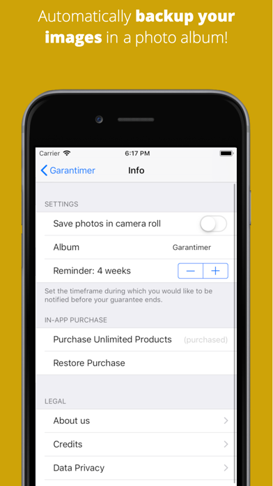 Garantimer efficiently supports you in keeping track of the warranty of your purchased products. You will be informed before a product warranty will expire in order to file any defect with the vendor. You can scan your invoice directly in the App to avoid searching for required documentation.
