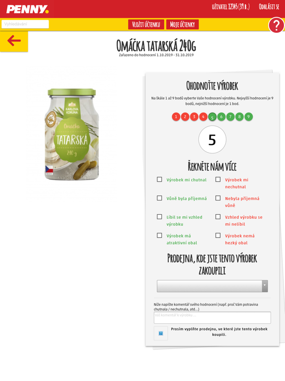 Do aplikace Kvalita PENNY vyplníte své hodnocení výrobku. Hodnotí se na stupnici, kdy 9 je nejlepší hodnocení a 1 nejhorší.