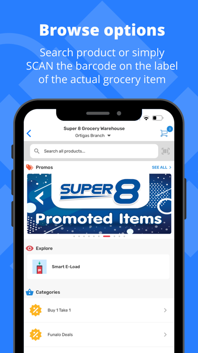 Browsing options to easily find what you’re looking for. Browse per category or see all products, search product or simply SCAN the barcode on the label of the actual grocery item, no need to scroll up or down.