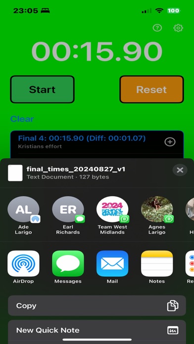 Standing Start Stop Watch designed for use in the velodrome with riders undertaking standing starts with a 15 second count down, beep at 10 seconds then at 5,4,3,2,1, and a longer bet at 0 just like if you used the start gate. The stop watch then start automatically alongside the long beep. (Great if you are trying to time laps and hold the rider on training sessions. (the reason why I designed it). I have also added in an option for dynamic background linked to a schedule you can modify number of laps track length etc. The dynamic background is great for providing quick and easy feedback to teh rider to let them know if they are up or down on the planned schedule after each lap (background screen goes red or green). After the session if you wish you can then download the laps and final times with notes out to a CSV file for keeping a record on a Numbers of Excel spreadsheet. If your doing flying efforts then the option to remove the 15 second count down is also there with all the same functions.