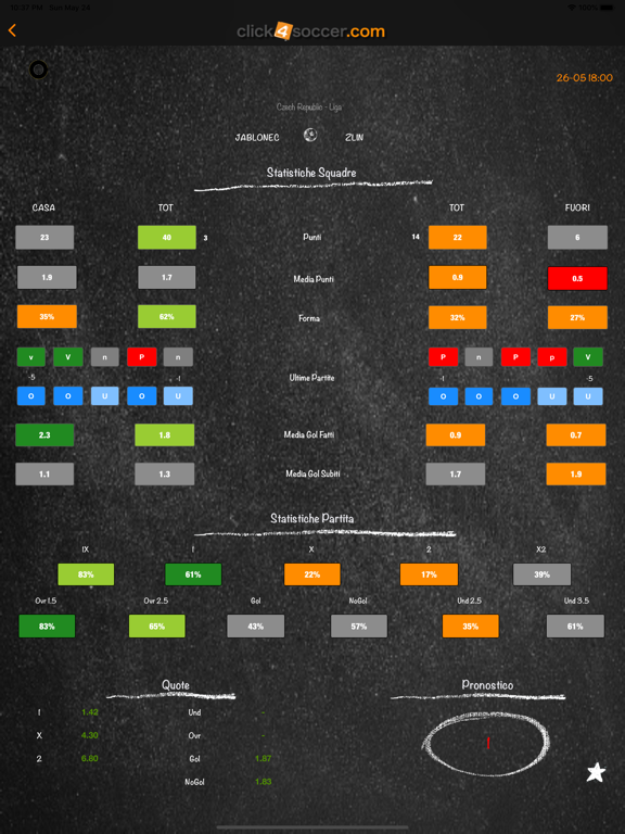 Ogni giorno i nostri esperti analizzano dati, notizie, quote e quant'altro di utile per poter identificare il miglior pronostico delle partite dei giorni successivi. Per ogni pronostico avrai l'indicazione della confidenza (Alta, Media o Normale) oltre che l'indicazione attraverso una stella, se il pronostico è fra quelli selezionati da click4soccer.com. Inoltre potrai accedere ai dettagli di ogni partite per analizzare informazioni e statistiche per permetterti di scegliere ancora più puntualmente, i pronostici che più ti convincono! E da oggi potrai avere anche le quote di ogni evento!