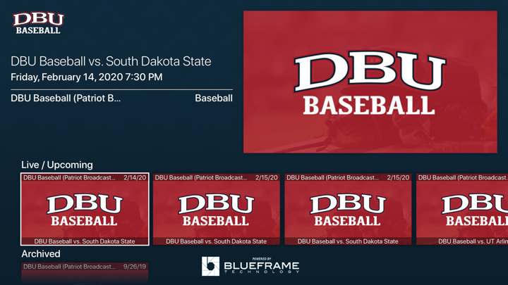 The DBU Baseball Apple TV app gives you quick and easy access to your favorite Dallas Baptist University live and archived baseball events. DBU Baseball is a partnership between Dallas Baptist University and BlueFrame Technology.