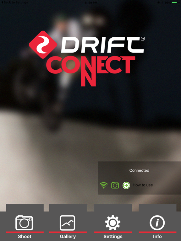 The Drift Connect app is ideal for connecting your mobile device to the Drift Stealth 2 action camera allowing remote control and accessibility to features. See what the camera records through a live preview, access and change settings, swap between Video and Photo modes, view recorded files in the Gallery, download directly to your mobile device and upload using sharing features.