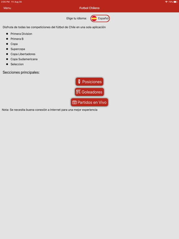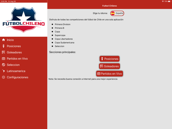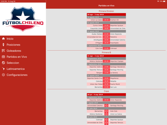 Esta aplicación te permitirá seguir en vivo y en directo todos los partidos del futbol de Chile y de las copas internacionales, así como los partidos de la Selección de fútbol chilena de forma online. Además se brinda toda la información relevante a las competiciones más importantes de Chile: tabla de posiciones, tabla de goleadores y más.