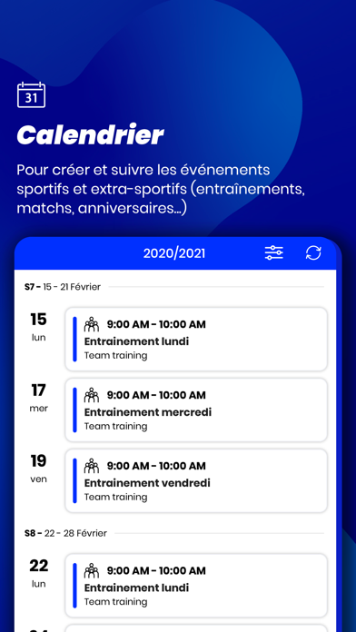 - Calendrier : suivez votre calendrier d’entraînement et de compétitions grâce à une synchronisation avec les données fédérales et le planning d’entraînement MyCoach de votre enseignant.