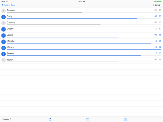 This application will let you track the playing time for each player. You can use it during the game to help manage playing time for those cases when equal playing time is the goal, or after the game is over to see what actually happened.