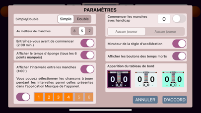 Basée sur les règles officielles du tennis de table, l'application gère la plupart des situations de la partie, telles que le simple, le double, les intervalles, les temps morts, la règle d'accélération, etc. Si deux appareils sur lesquels l'application est installée sont disponibles, l'un d'eux peut faire office de télécommande.