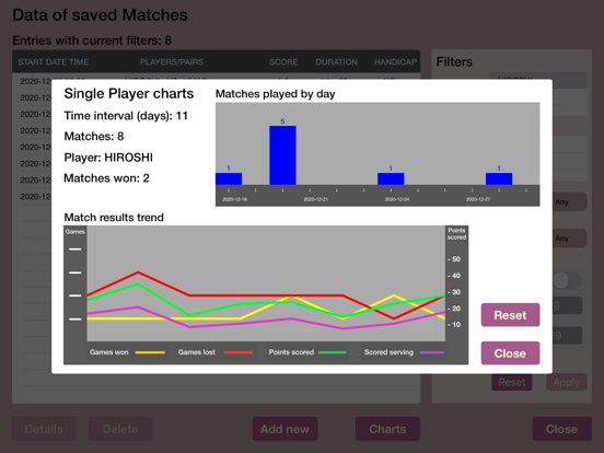 A la fin de chaque partie un résumé est affiché et peut être partagé. De plus, pour chaque match, l'application enregistre et sauvegarde de nombreuses données : joueurs, score et durée de chaque manche, points marqués, etc. Les données de chaque partie peuvent être sélectionnées, visualisées et partagées. Il est également possible de compléter avec le score final des parties interrompus et également d'ajouter manuellement de nouveaux paries qui n'ont pas été « arbitrés » avec l'application. Pour mettre en évidence les résultats et les tendances, les données des parties peuvent être présentées sous forme de graphiques dans différents formats : résumé, solo, parties entre deux joueurs, également dans un intervalle donné.