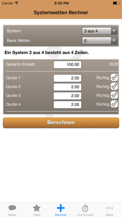 Des weiteren ist ein Systemwetten-Rechner verfügbar, welcher (mit hilfreicher Erläuterung) einfach zu bedienen ist.