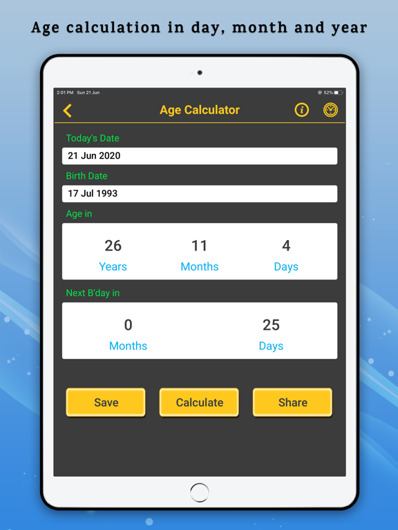 • Get detail about your age in years, months, weeks, days, hours, minutes, seconds