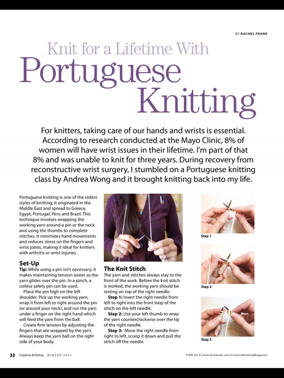 Creative Knitting’s primary goal is to bring knitters a variety of fun-to-knit projects using wonderful new yarns and patterns that are easy to understand. Each issue contains a basic stitch guide, metric conversion chart, knit technique reference page, abbreviation glossary and other references that make your knitting guaranteed to work out. Every issue you’ll get projects photographed in full color with clear, see-every-stitch detail, including fashionable designs for real people, afghans and home accents, accessories for entertaining, delightful baby and kids garments, and gift ideas that don’t take a huge time or dollar expenditure. Our Knitting Class section and In The Know articles offer clearly written information to enhance your knitting experience.