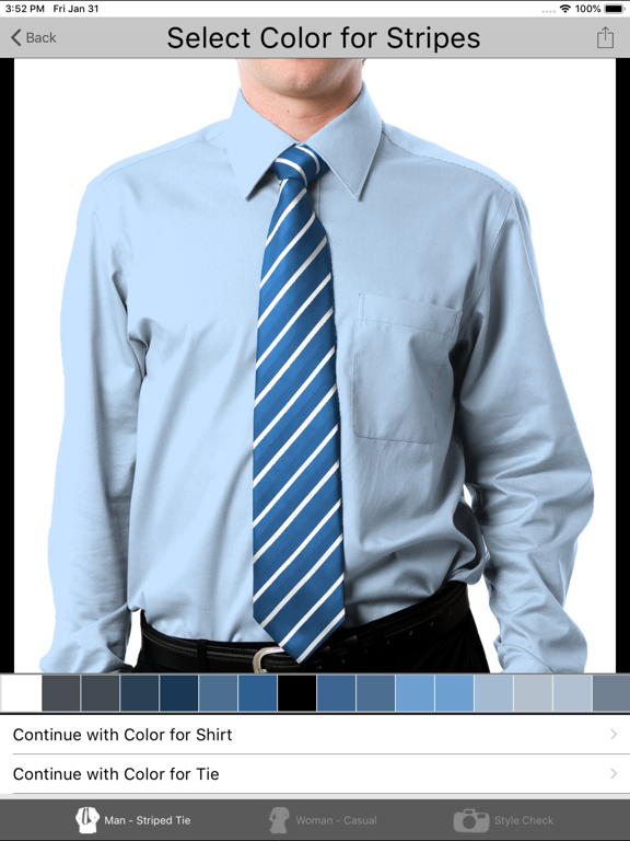 Choisis une couleur pour ta chemise et tu reçois toutes les couleurs assorties pour ta cravate. Tu peux choisir n'importe quel ordre. Commence par exemple avec le costume, ensuite choisis la chemise et finis par la cravate. Tu peux aussi commencer par la chemise ou la cravate. Quoi que soit l'ordre, l'application te montre seulement les couleurs appropriées.