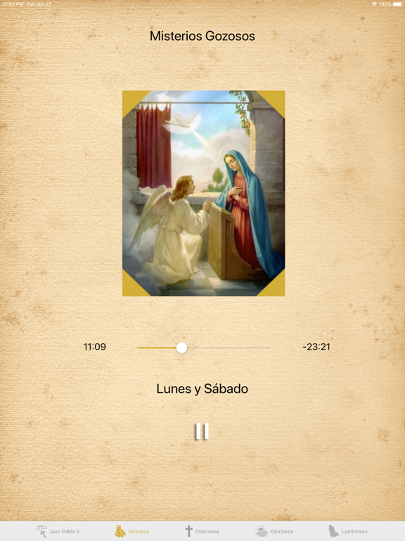 Sin tiempo para rezar? con el Santo Rosario Interactivo podrás escuchar las Oraciones Padre Nuestro, Ave María y los Misterios en voz de San Juan Pablo II. Contiene un Rosario interactivo con indicador para cada oración.