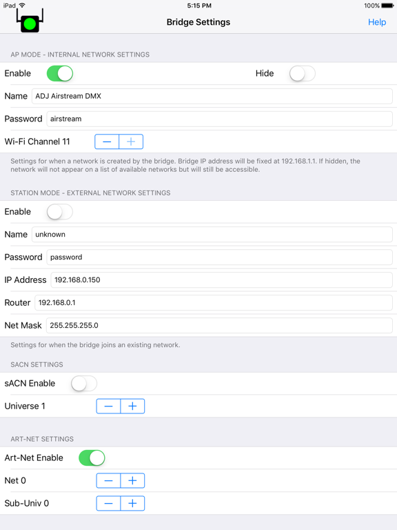 Airstream Bridge Config is a utility for the ADJ Airstream DMX Bridge. It allows you to configure the network settings for the bridge over the air. You can change things like network names, passwords, Art-Net settings and sACN universe number.