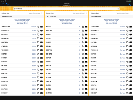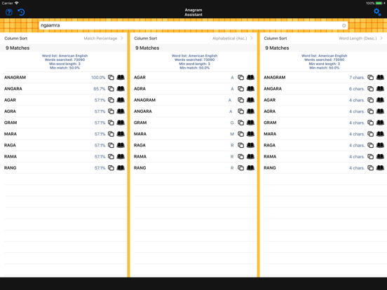 Solve anagram and crossword puzzles quickly! Just enter the anagram or known crossword letters and the app will find all the possible word matches. This can be used with many different types of word puzzles or any traditional crossword puzzle. Simply select the type of puzzle you need assistance with (anagram or crossword) from the app settings and app will process the input accordingly.