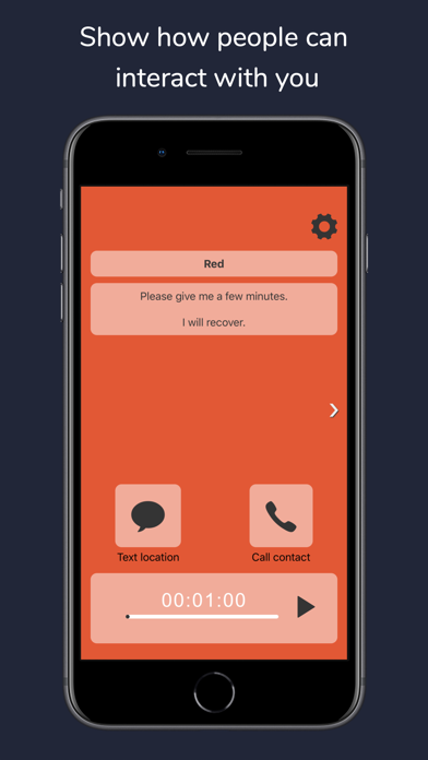 ASK uses the globally recognised interaction colour scheme: Red, Yellow, Green. The text on the screens is completely editable to suit the needs of the user. This is an easy to use, highly visible way to communicate needs and wishes depending upon current communication status. There are timers giving the autistic person control over how long they want to be undisturbed.
