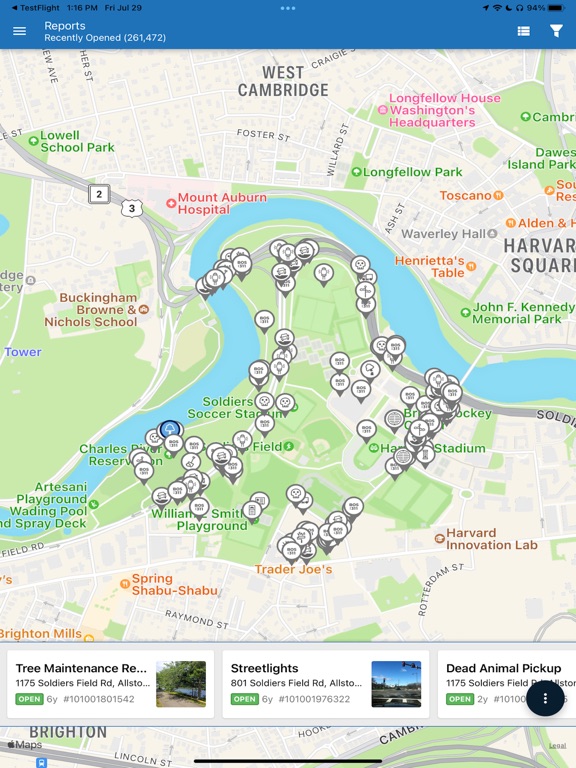 Les rapports sont automatiquement introduits dans le système de bons de travail de la ville de Boston pour les suivre et les attribuer au personnel de la ville. Grâce à l'application, vous pouvez suivre l'état de votre demande, ainsi que les statuts d'autres rapports dans la ville. Il existe même une carte pour obtenir un aperçu facile des rapports actifs à Boston.