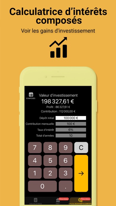 •Visualisations de croissance claires : Des graphiques d’amortissement et d’intérêts composés offrent une vue complète de vos progrès de •prêt ou d'investissement.
