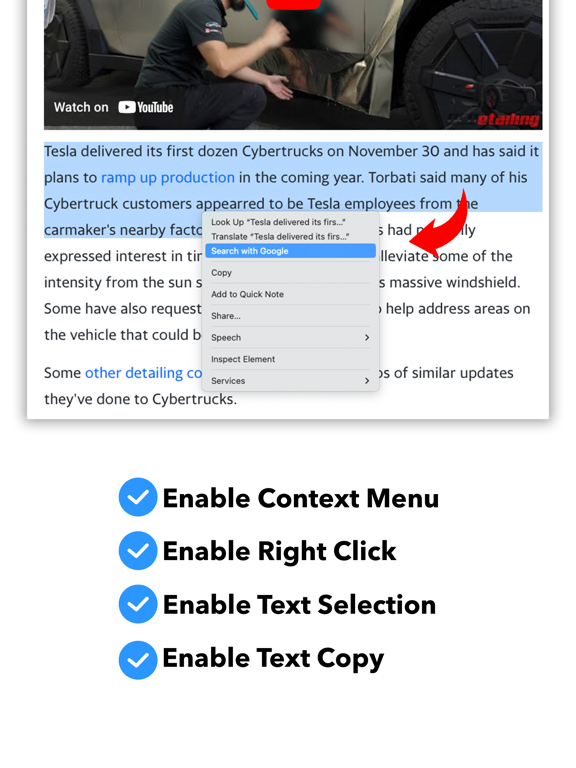 [Enable Context Menu] is a Safari extension which enables disabled context menu, right mouse click(or long press), text selection and copy.
