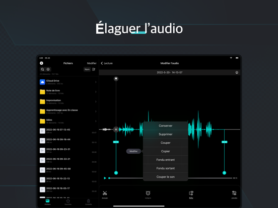 Dictaphone est votre solution définitive pour un enregistreur vocal avec un son de qualité, qui enregistre facilement les entretiens, les discours, les lectures, les réunions, les inspirations, tout en offrant des fonctionnalités de lecture et d'édition comme raccourcir, copier/couper/coller, fractionner, raccorder, insérer et combiner.