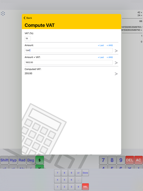 * Memorizing results, e.g. via the ANS button and through the calculation sheets, get old values by tapping on them in the sheet