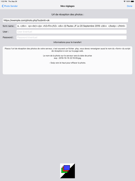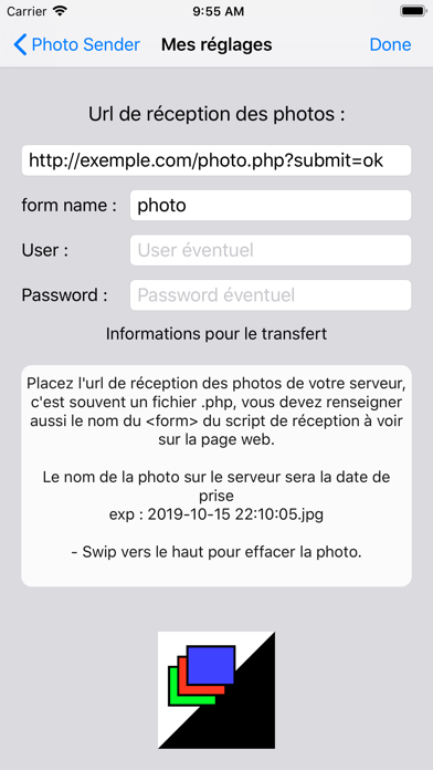 Permet d' envoyer rapidement des photos vers un serveur web classique avec les infos GPS et de date en EXIF. Parfait pour la constitution d'un service web personnel de consultation de photos.