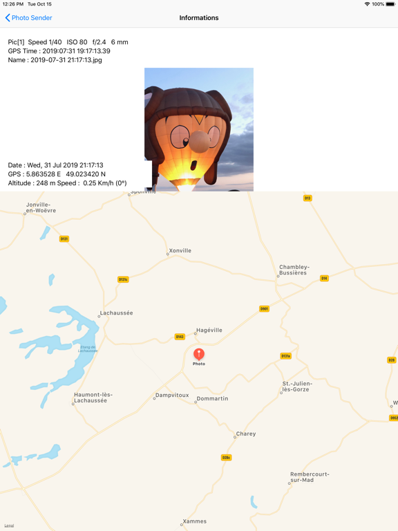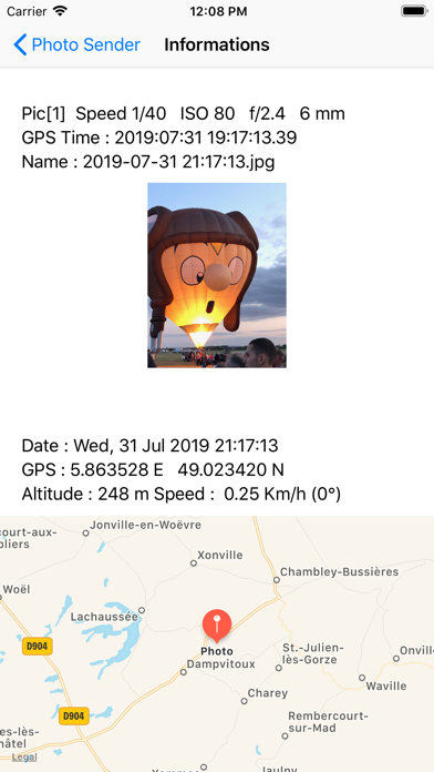 Les photos conservent la position GPS géographique lors de la prise de vue, la date de la prise et les informations de déplacement, altitude, vitesse et direction, ces informations disparaissent lors des transferts avec les systèmes actuels. Un commutateur dans les préférences de l'application permet de ne pas transmettre les informations EXIF et GPS si nécessaire.