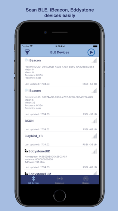 • Scan all nearby Bluetooth Low Energy, iBeacon and Eddystone devices