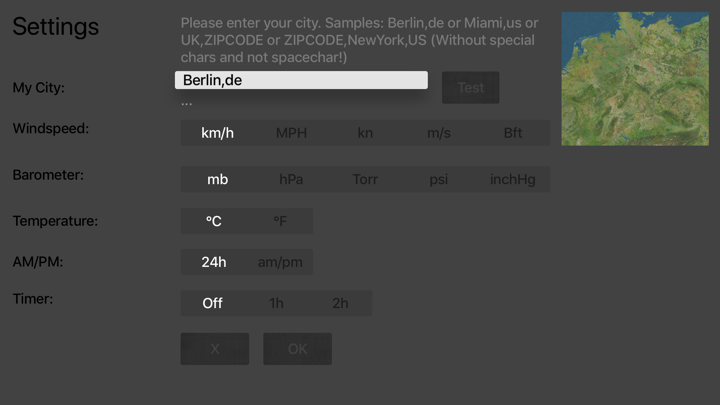 Use your Apple TV as a virtual anemometer. In the settings you can save your own city. Additional temperature display, sensed temperature, humidity, barometer. 5 day preview and more.