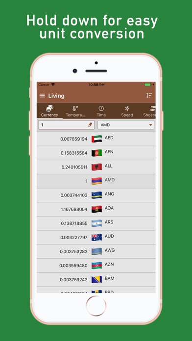 - Living : exchange rate, temperature, time, speed, shoes, clothing, hat, ring