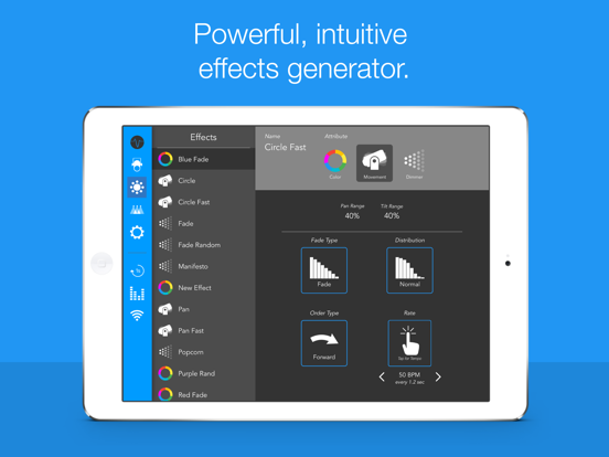 Vibrio is a revolutionary DMX lighting control software for the iPad. One intuitive solution to handle lighting for your venue or show. It connects to the lights wirelessly using an ethernet-to-DMX converter and the Art-Net protocol. We believe Vibrio bridges the gap between lighting programmers and designers by having a simple interface that even beginners can learn quickly. When designing Vibrio, we took the best features of high-end lighting consoles and brought them to the iPad.